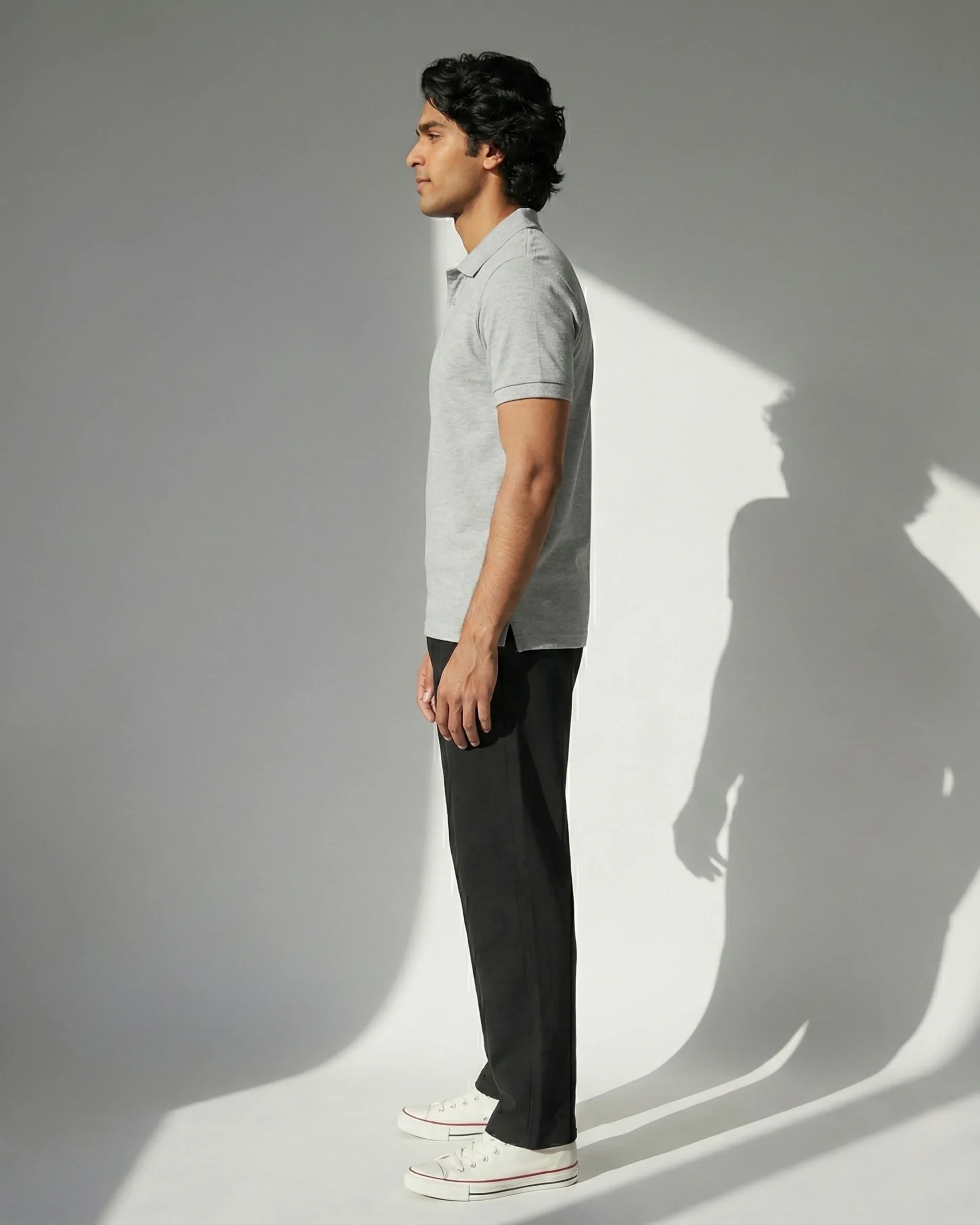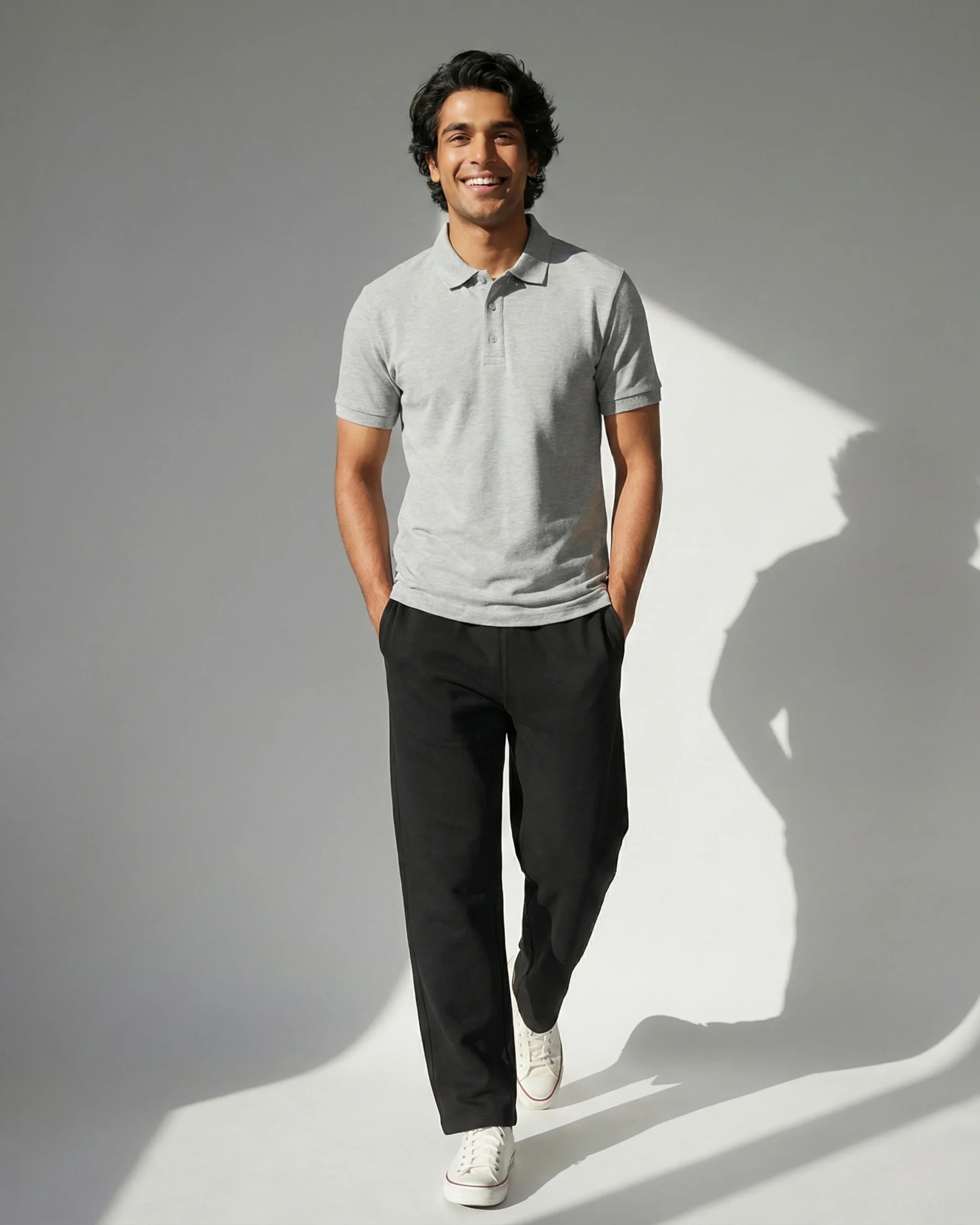 Grey Melange Polo T-Shirt & Sweatpants Black Combo